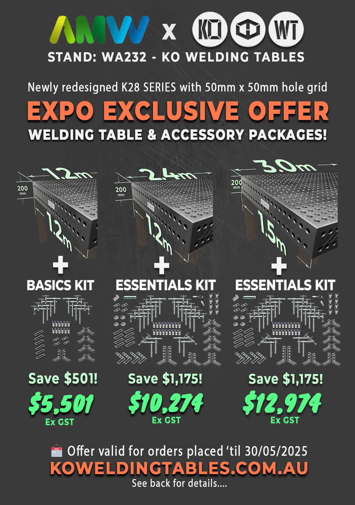 Order and pay a deposit for any brand spanking newly designed K28 SERIES Welding Table to save a whopping 50% on a BASICS or ESSENTIALS accessories kit!